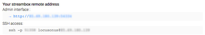 You can access your streambox from anywhere via the internet. This will allow you to adjust parameters and even to restart your streambox online. To do this you must first check "turn on remote access service on boot" in settings when you set up your box via streambox.local.